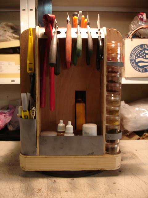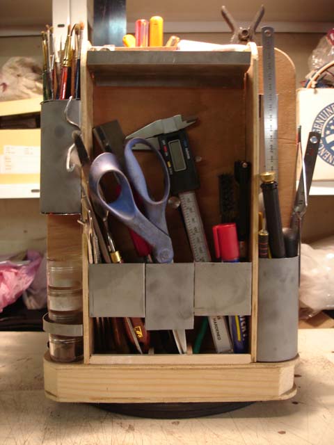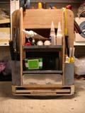 Petit rack à outils d'établi que j'ai réalisé pour ne plus chercher sans arrêt les outils. Base pivotante, quatre faces, quatre angles, un tirroir